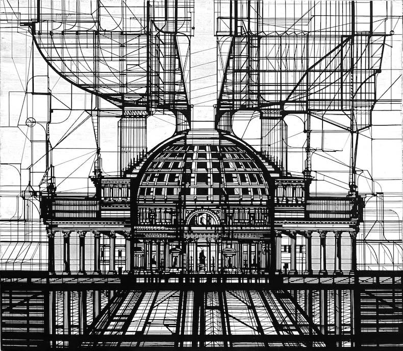 Его графика – это серьезное размышление о месте человека и технологий в настоящем и будущем. Образы Рима, Константинополя, Александрии словно растворяются в футуристической среде, оставаясь при этом узнаваемыми. А главным элементом является металлическая ажурная конструкция, отсылающая к триумфальной арке Римской империи и вместе в тем символизирующая собой вневременной портала в идеальный мегаполис.