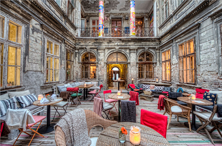 Мебель, собранная буквально на помойках, сотрясаемые громкой музыкой расписанные стены с кусками изящно торчащей арматуры, любопытные артефакты тут и там и дорогие алкогольные напитки не самого лучшего качества – все это есть в самом знаменитом, легендарном, бесподобном, восхитительном, отвратительном и туристическом «руинном пабе» Szimpla Kert.